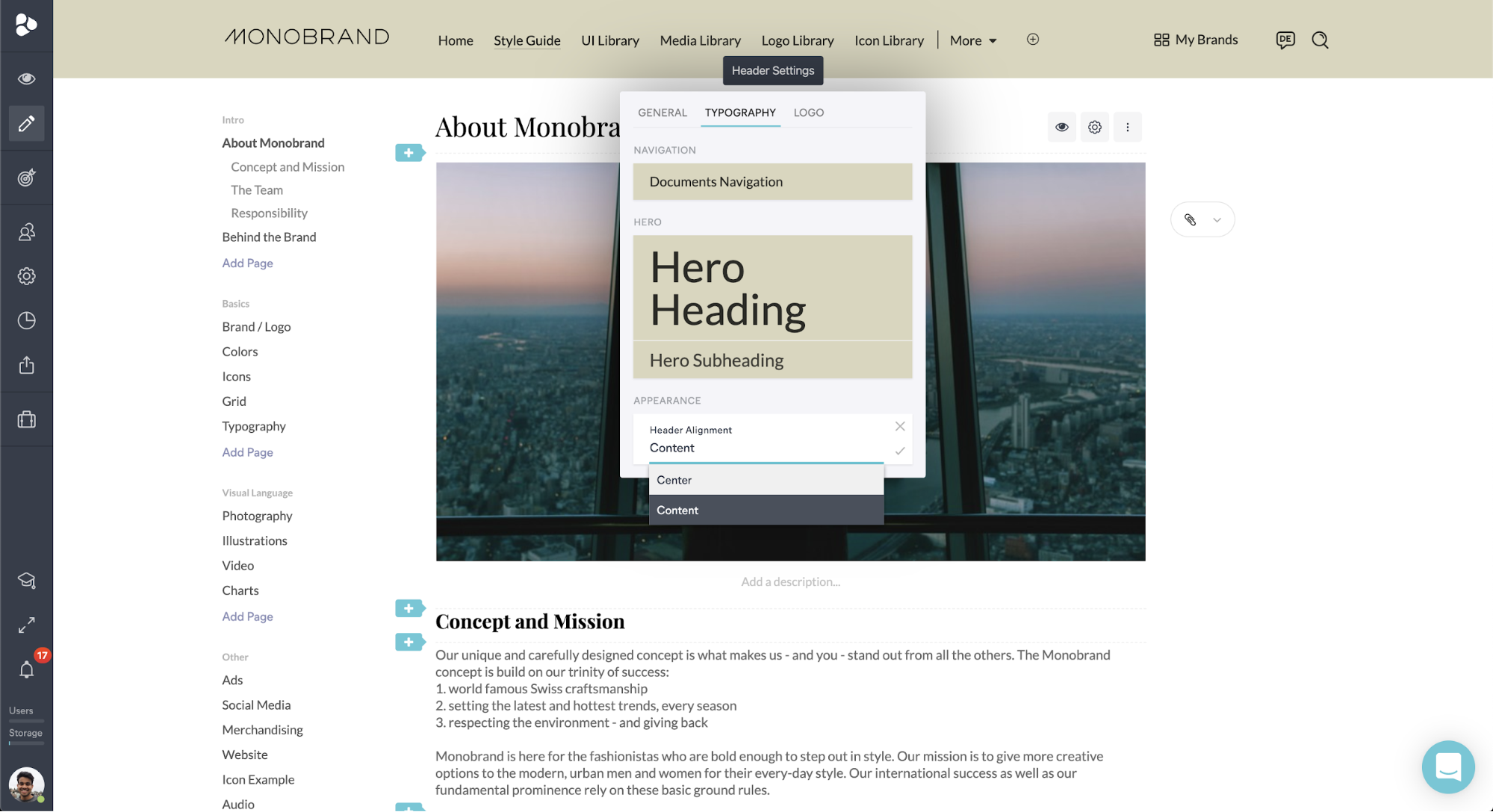 Another nifty improvement empowering you with more freedom to customize your Style Guide is the option to change the header and subheader alignment. You now have the ability to either have your header and subheader centered or aligned to the content on the page.