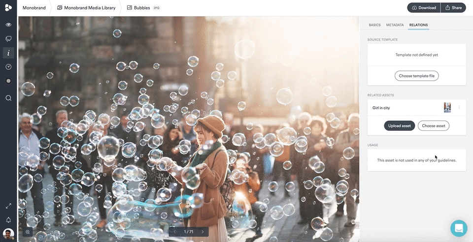 With the Asset Relations feature, you’re able to establish connections between assets. Oversee all related assets in one glance, and be able to quickly navigate back and forth between them. Connect assets which you plan to use in a specific campaign, make a reference to the source file, and implement an additional level of structuring.