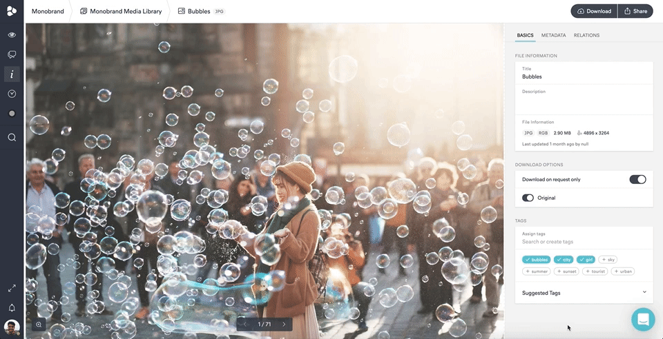 The Auto-Tagging functionality uses AI to generate tags for your assets. Once activated, the feature will analyze each asset before suggesting tags to categorize existing and new assets. Simply add and remove tags by clicking on the ‘Suggested Tags.’ Bear in mind that the supported file formats for auto-tagging are: png, jpg, tif, tiff, and jpeg.